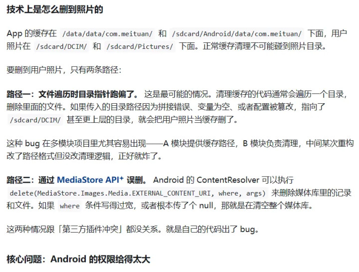 名为“步调员楼琮”的用户,分析了删相片在技能上的旅途,文献遍历时目次指针跑偏了玩忽通过MediaStore API误删,中枢问题照旧安卓的权限给太大了。