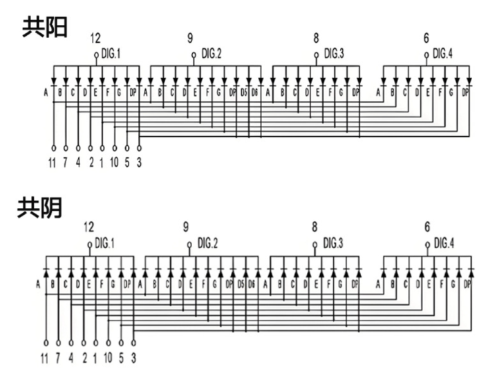 共阴极(Common Cathode)七段数码管是统共LED的阴极聚合在沿途并接地(GND)的结构。重点亮某个段,需要在对应的阳极上提供高电平(3.3V或5V)。
