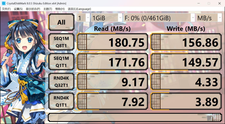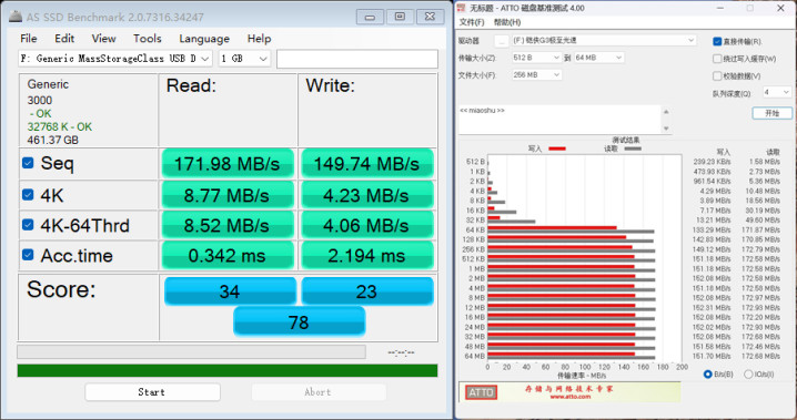 一样条款下再用AS SSD Benchmark和ATTO区别考据,写入速率也齐稳在150MB/s,读取速率稳在171MB/,速率齐逾越了U3野心的50%以上,这是开了氮气加快吗?!