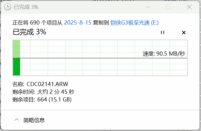 我顺手搭配二十多块钱的绿联CM265读卡器,在win11下复制文献测试,拷贝15GB傍边的像片文献到PC上仅需2分多钟,速率表示在90MB/秒。