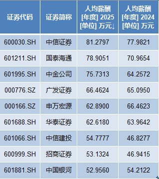 而从数值看,中信证券的2025年的东说念主均薪酬最高,跳跃80万元,达到81.28万元。