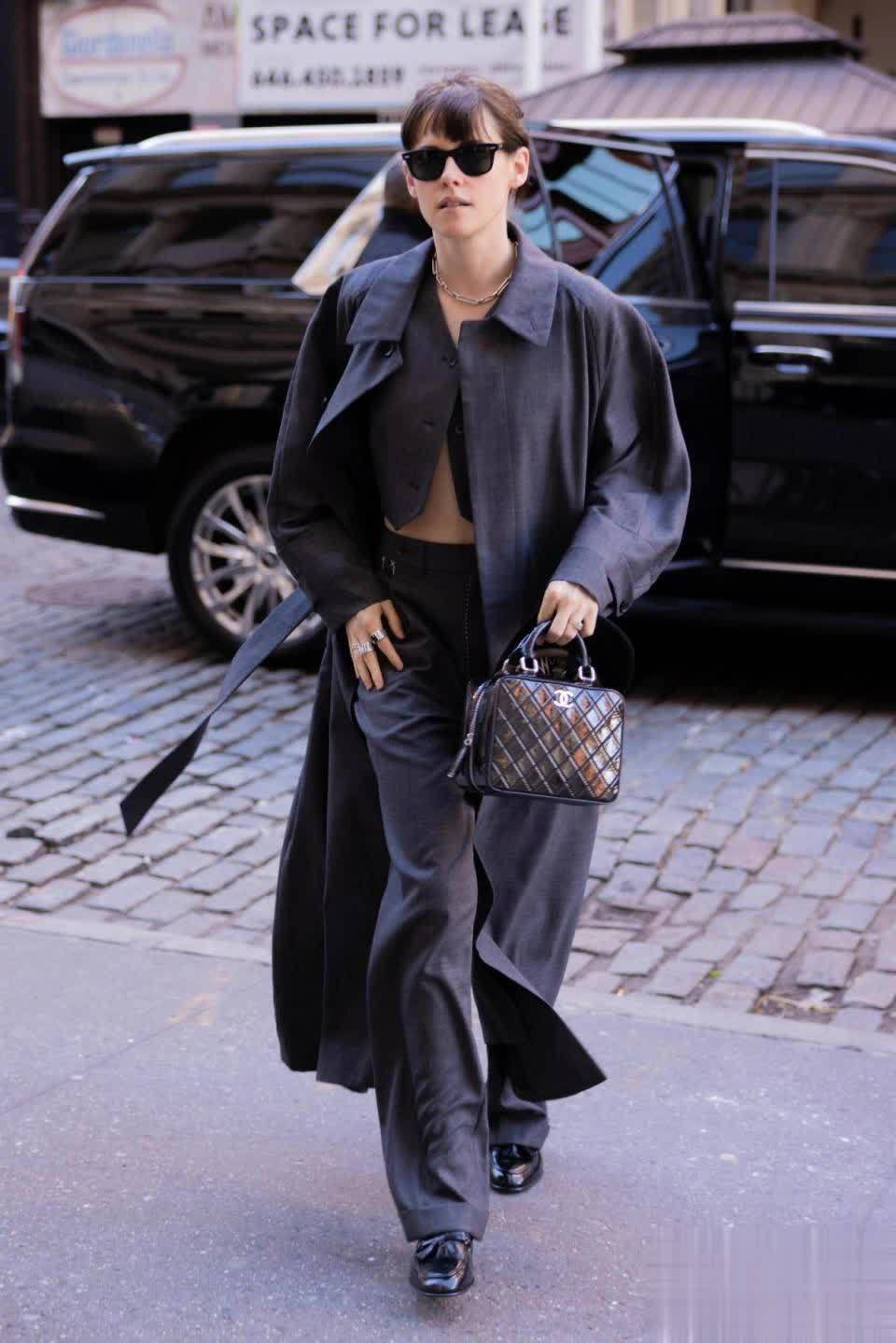 克里斯丁穿衣安定,随着她学穿搭,松开赚足回头率。jk款西装外衣搭配同色系廓形风衣,松弛有度、慵懒个性。