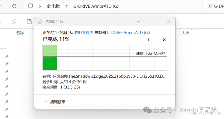 实测36G的4K影视资源,从电脑拷贝到ArmorATD,粗略用了6分钟控制,平均速率舒适在120MB/s控制。这个证实关于机械硬盘来说格外舒适,莫得显着的掉速情况。