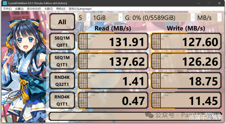 接口是USB-C 5Gbps,官方标称读取速率最高130MB/s。用CrystalDiskMark实测,规章读取粗略在130MB/s控制,规章写入也能舒适在125MB/s控制,基本合适官方标称。
