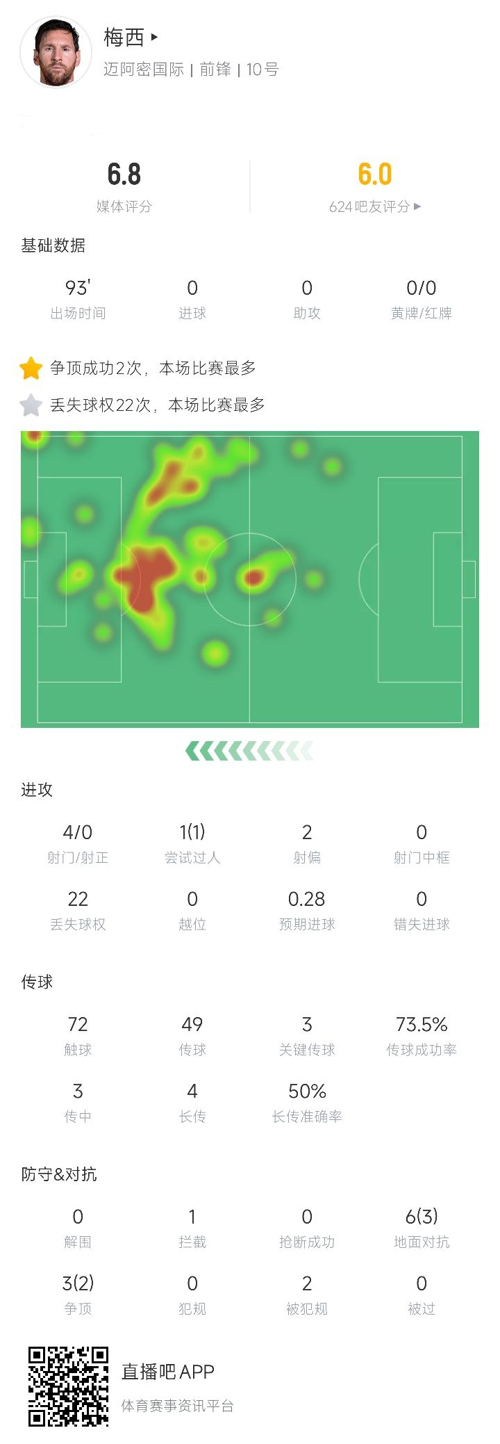 数据方面,梅西全场4次射门,小九体育直播0射正;1次尝试过东说念主1次见效;22次丢失球权全场最多。