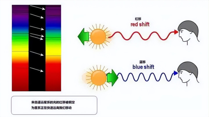 他发现,远方星系发出的光,其光谱会向红光方针偏移,这种现象被称为“红移”。根据物理学中的多普勒效应,当光源远隔不雅测者时,不雅测到的光谱会发生红移,且光源远隔的速率越快,红移现象越显然。