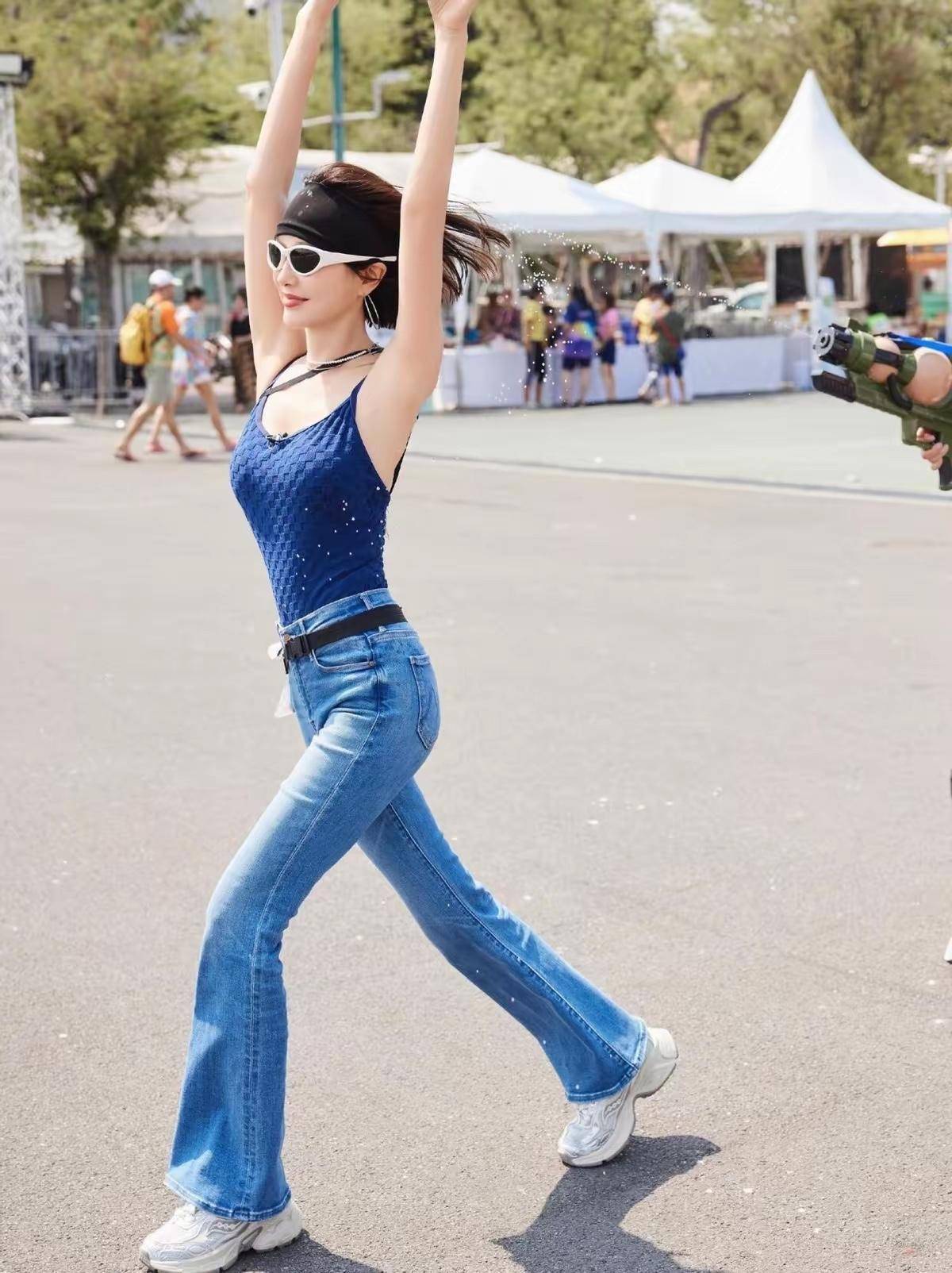 她还戴着玄色发带与白色贯通墨镜,碎发被汗水微微打湿,再搭配大圈耳饰与细项链,增添了几分女性柔好意思感。玩水时的她景况淘气又鲜美,每一个当作齐舒展当然,莫得摆拍的僵硬感,水珠沾在发丝与衣料上,反而让举座造型更有夏令氛围感,少了良好距离感,多了几分接地气的鲜美与元气。