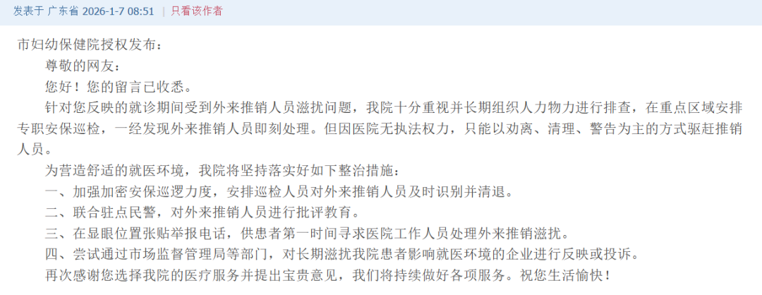 针对市民反馈的问题,深圳市妇幼保健院于1月7日修起称,病院特别爱重,并长久组织东谈主力物力进行排查,在重心区域安排专职安保巡检,依然发现外来倾销东谈主员即刻处理。