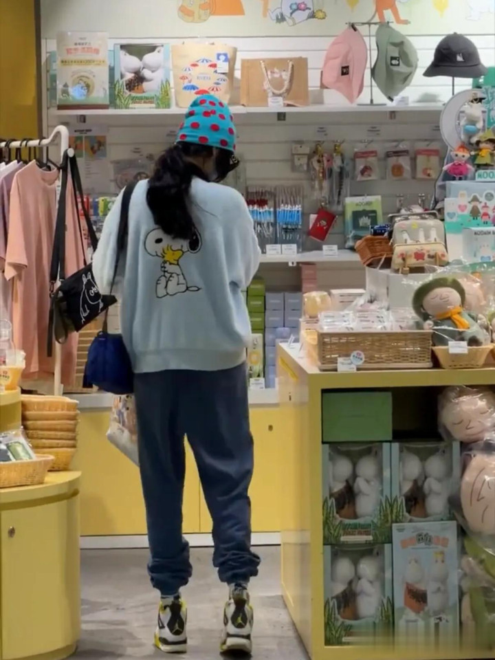 扎着利落马尾,头戴蓝色波点忠实帽,沉静蓝色卡通卫衣搭配同色系失业裤,脚上踩着从简浮现鞋,全身高下齐是减龄感。