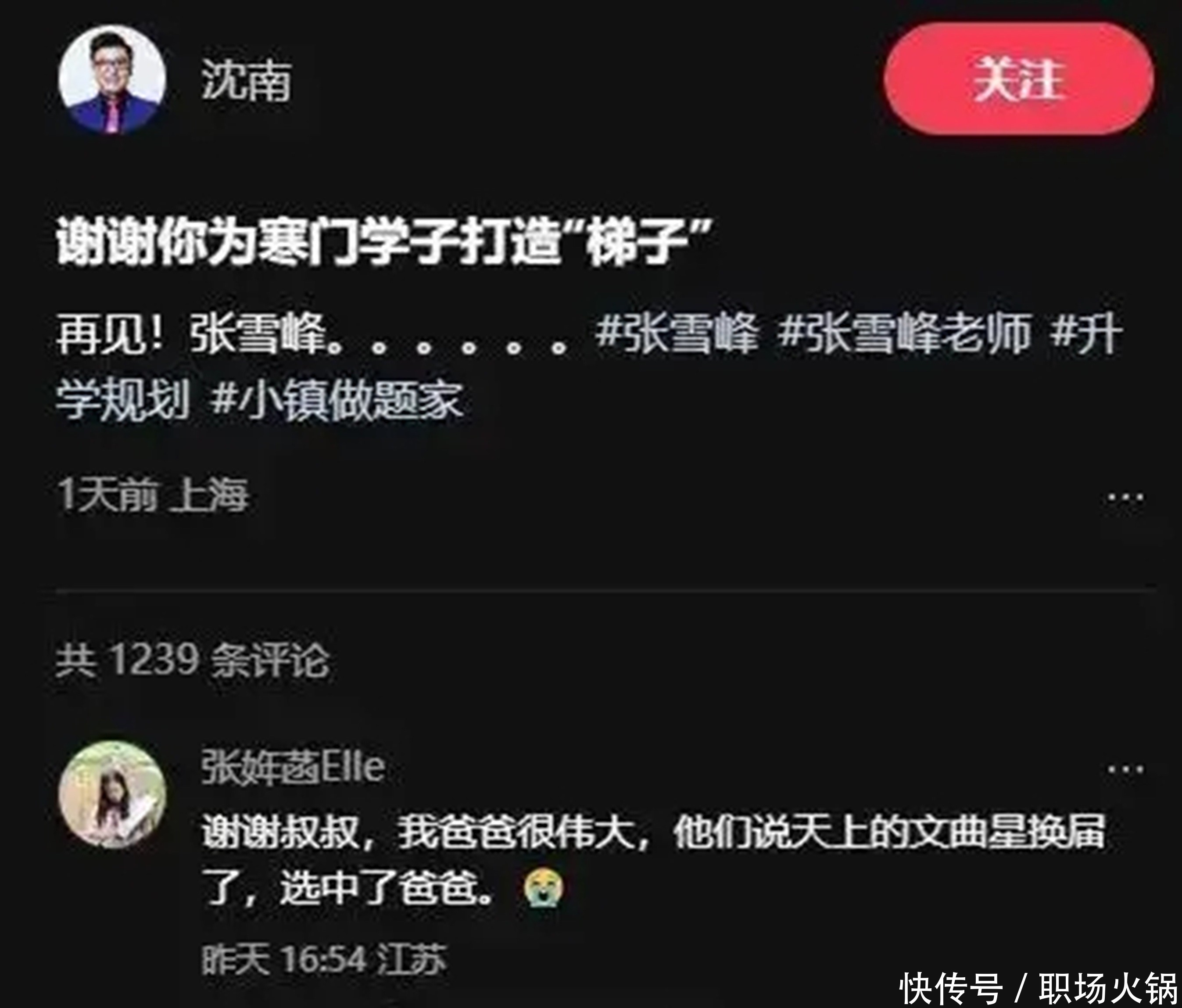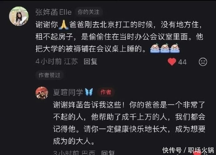 归天第三天,他11岁的儿子张姩菡发文惦念,“天上的文曲星换届了,选中了爸爸”,在这种诗意的念念念中,竟不测通晓出爸爸果透露死因。儿子在哀念念中写谈:爸爸刚去北京打工的时间,租不起屋子,悄悄睡在会议室里,用的如故大学时的被褥。爸爸总说等儿子考上大学,一定要躬行帮她填志愿,她却没比及那一天。父女伴的时光,竟只消短短十年。张雪峰是妥妥的儿子奴,起名““姩菡”,“姩”意为年华,“菡”是荷花,寓意儿子能像荷花那样秀气耿介,又因儿子属羊名字要带个草字头,但愿她能“吃饱”。