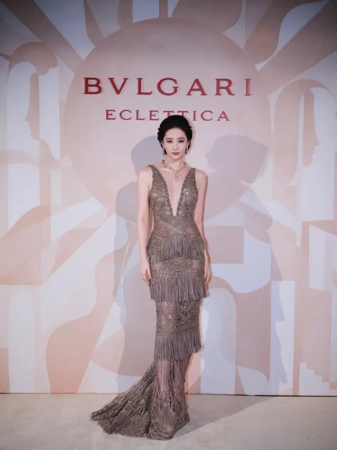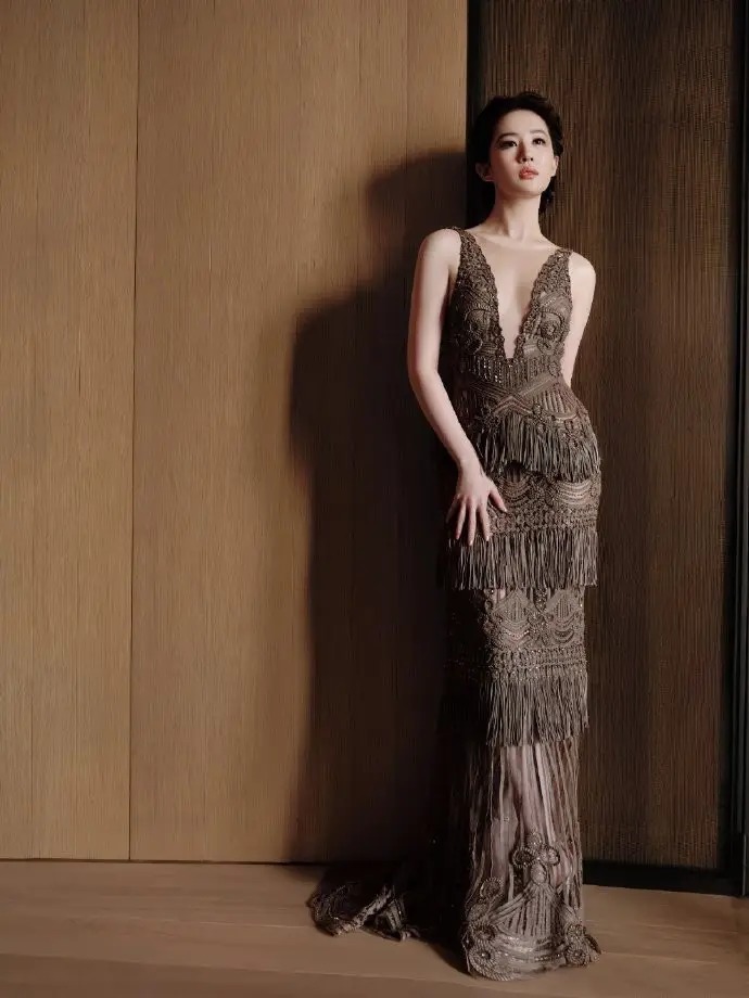 刘亦菲身着一袭深V鎏金流苏高定长裙,尽显东方好意思学与意式糜掷的齐备共振。