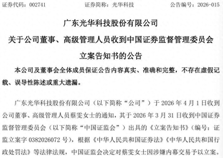 4月1日晚间,光华科技(002741)公告称,当日收到公司董事、高等处置东说念主员蔡雯的陈说,其于3月31日收到中国证监会出具的《立案奉告书》,证据关系法律顺次,中国证监会决定对蔡雯因涉嫌内幕来回赐与立案。