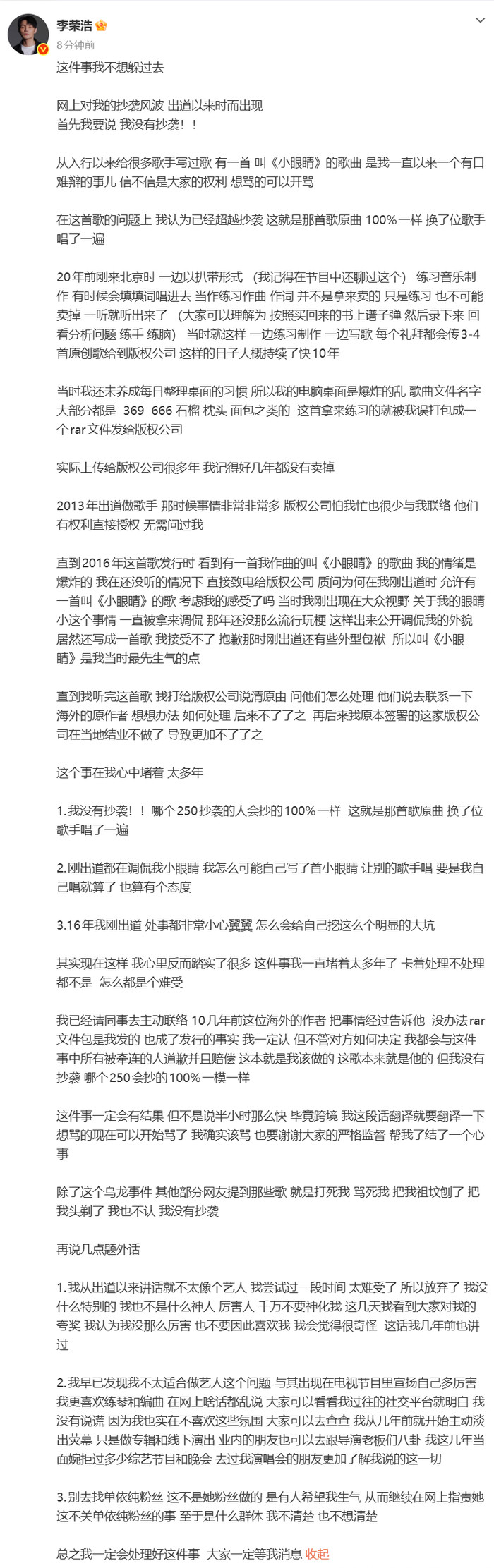李荣浩发文否定抄袭:刚出说念王人在戏弄我眼睛小,我怎么可能本身写首《小眼睛》,让别的歌手唱