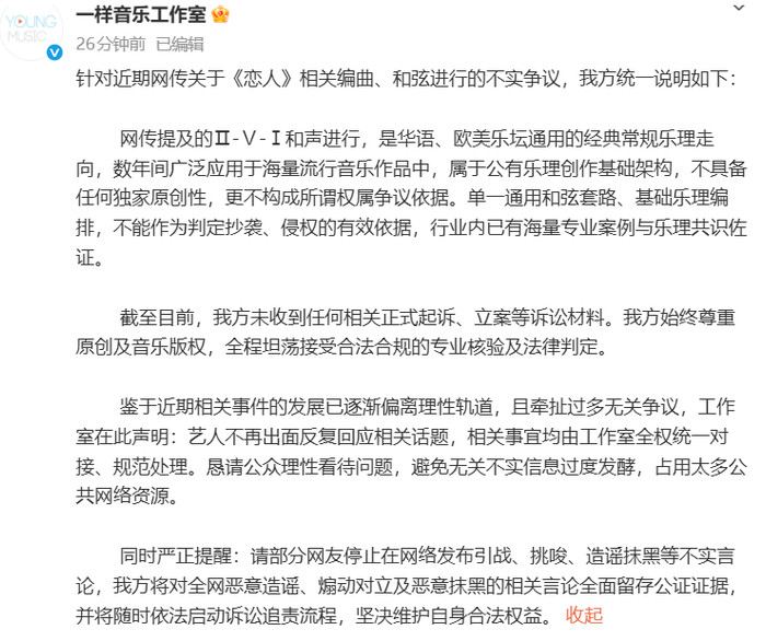 截止现在,本身未收到任何关系负责告状、立案等诉讼材料。本身永恒尊重原创及音乐版权,全程直露剿袭正当合规的专科核验及法律判定。